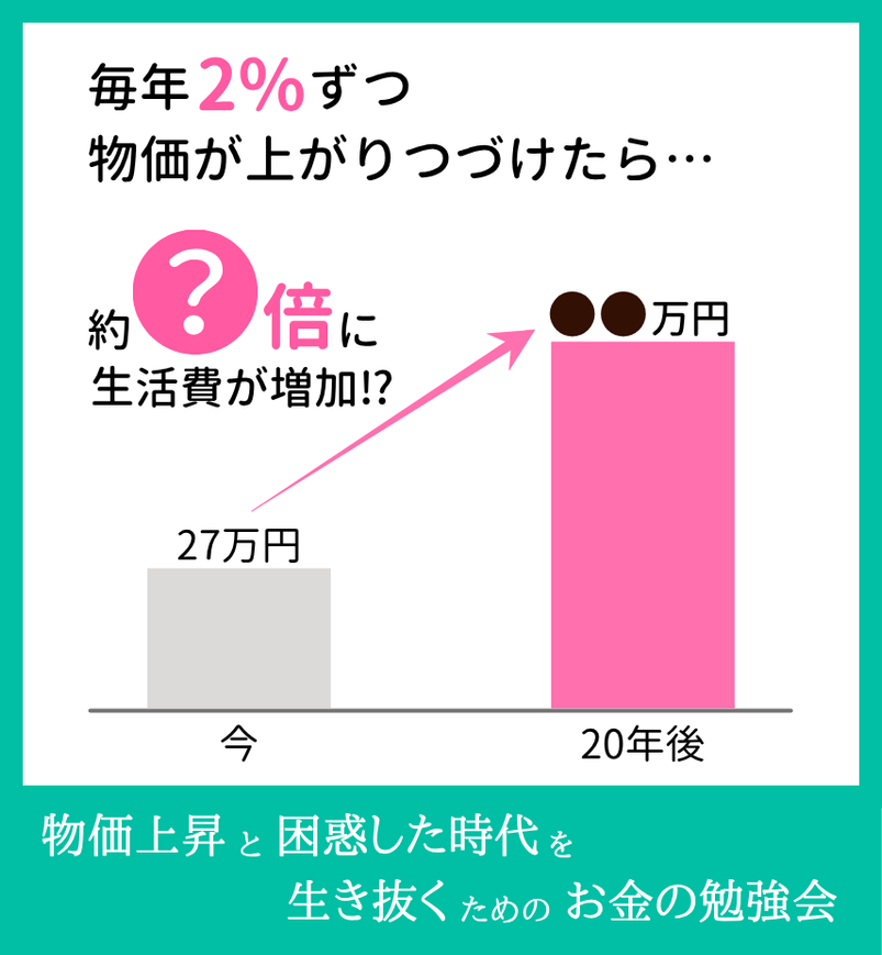 今、月27万円の生活費で暮らしているとしましょう。毎年2%ずつ物価が上がりつづける場合、20年後も今と同等の暮らしを維持するためには、約1.5倍の月40万円が必要です。